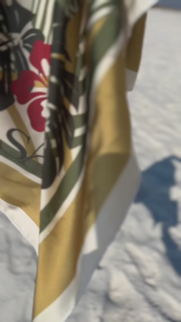 The largest summer scarf, in a bold geo palm print. Printed on the silkiest satin we’ve ever felt.  The perfect addition to luxe out your fit!  Bonus, because of its massive size, can be worn a million ways.  Print has our logo and says Made in America too!